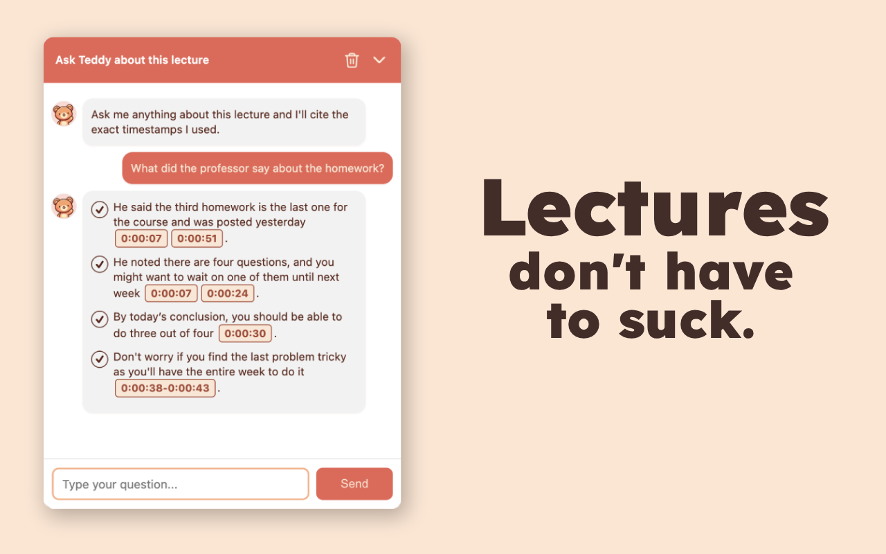 Are lectures stressing you out? Can’t find the exact moment a professor said something or want to check if they gave any hints about an upcoming exam? Teddy is here to give you a big warm hug. Just .
